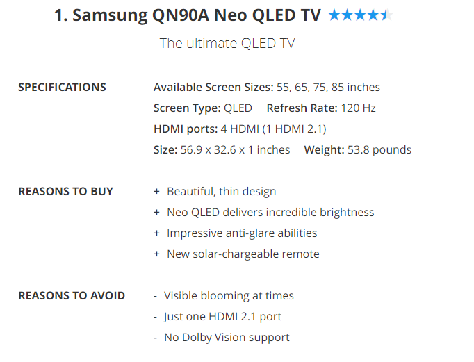 The Samsung QN90A Neo QLED is the best TV we've reviewed, delivering superb picture quality with its combination of QLED color and mini-LED backlight (the ingredients that make up Neo QLED). Pair that performance with fantastic sound, rich smart features and a stylish design, and you've got the best TV we've reviewed recently. Just be aware that this premium 4K smart TV doesn't come cheap.The LG C1 OLED is also among the top TVs you can buy. It features a gorgeous OLED panel; it's a great 4K smart TV, and it's the best gaming TV we've ever seen. The TCL 6-Series Roku TV (R635) is the ultimate in affordable TVs, giving you the best 4K smart TV we've seen for less than $1,000. In fact, ignoring the budget-friendly price, it's still one of the best TVs on the market, thanks to a quantum-dot enhanced LCD and mini-LED-backed display and feature-rich Roku TV interface. Combine this with superior gaming features and a refined design, and it's got plenty to love.