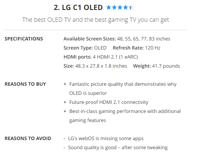 The LG C1 OLED is a fantastic value among premium TVs, offering an amazing OLED display, a full complement of HDMI 2.1 ports, and the best gaming performance and features you can get. The display offers rich picture quality with impeccable contrast and sharpness, superb HDR support and gaming performance that beats everything else we've seen. Combine all of that with a stunning design and better-than-average sound, and you've got one of the best TVs you can buy.LG's webOS faces stiffer competition on app selection and features, but smart options, like your choice of Google Assistant and Amazon Alexa voice assistants, AI-driven sports alerts, and gaming features like the game optimizer menu and support for Google Stadia and Nvidia GeForce Cloud keep it in the mix for the best smart TVs. Just note that some have complained about a Dolby Atmos audio delay with certain devices, like the Xbox Series X. All in all, it delivers incredible quality and solid value for the admittedly premium price, making it one of the best TVs we've tested.