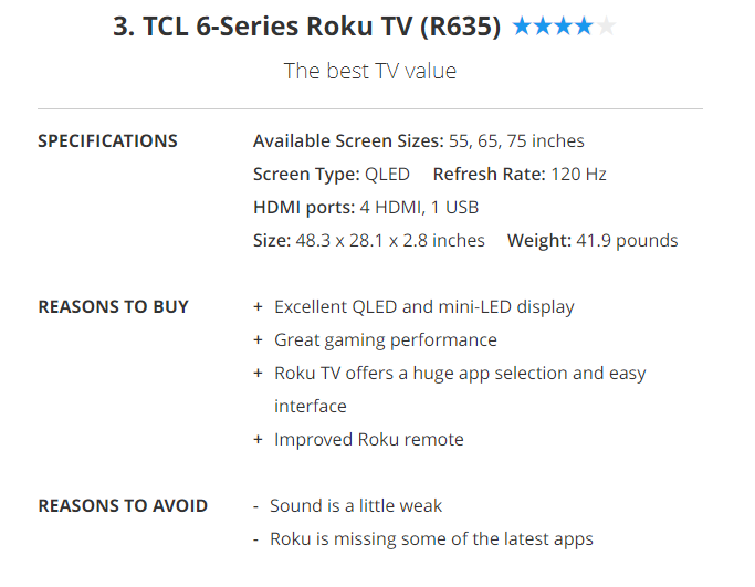 The TCL 6-Series Roku TV (R635) offers enormous value for it's affordable price, offering premium picture quality and a great smart TV experience for much less than the competition. As TCL's best mainstream smart TV the R635 ups the ante with mini-LED backlighting in addition to QLED. The result is impressive color and brightness, with some of the best HDR performance we've seen on anything this side of an OLED display.But TCL keeps delivering more, like THX Certified Game Mode, which makes the 6-Series one of the best gaming TVs available, even for yet-to-be-released consoles like the PS5 and the Xbox Series X. From the design's smart touches, like cable management in the stand, to the always-solid Roku TV platform, the TCL 6-Series R635 is the best TV value, and it's not even close.