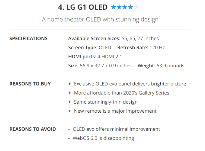 The LG G1 OLED TV is the updated version of LG's superb Gallery OLED, boasting a premium 20 millimeter-thick design and sleek flush-to-the-wall mounting setup. It's still the best 4K OLED TV made by LG, but as the first TV with LG's second-gen OLED evo technology, it falls short of some claimed performance improvements we were pretty excited for.That said, the LG G1 OLED is still an impressive OLED set, and LG has even knocked the price down a bit, while updating almost everything else about the set. The slim OLED features more comfortable remote control, enhanced gaming features, and the latest version of webOS, all while delivering the same excellent picture quality and impeccable sound that we expect from LG's best OLED models. The LG G1 OLED TV stands as a reminder of just how far modern TV technology has come — we just hope it hasn’t plateaued.