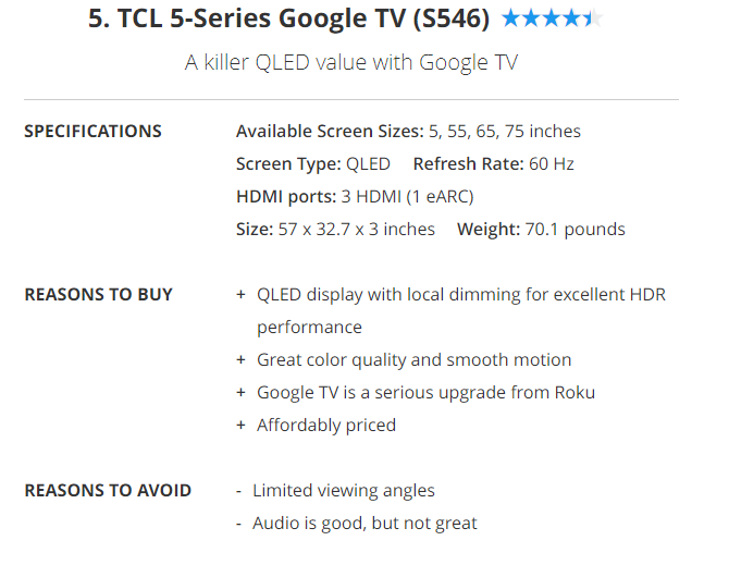 The TCL 5-Series Google TV (S546) wowed us with its combination of smart TV features, solid performance and great  value for your dollar. Building on the foundation of the already-good 5-Series, the move to Google TV gives the affordable 4K smart TV a more premium smart TV platform, one that offers personalized and customizable suggestions, a huge assortment of smart features, and deep Google Assistant integration that makes it a viable center for the entire home of connected gadgets.But it also offers a step up in other aspects of the TV. From color quality to lag times, the 5-Series Google TV is a more polished version of the 5-Series TV, delivering an excellent QLED 4K display, a slick remote control, and a surprisingly wide array of gaming features for a 60Hz TV. For a smart TV that sells for under $1,000 for most size options, it's easily one of the best TVs on the market.