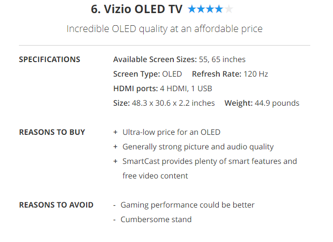 The Vizio OLED TV is the most affordable OLED TV on the market, and the first to offer a less-premium alternative to offerings from LG and Sony to shoppers in the United States. Selling for hundreds of dollars less than the competition, the Vizio OLED packs plenty of smart features alongside the 4K OLED display, and delivers the sort of premium picture quality that normally costs much more.Vizio's SmartCast smart TV platform has also expanded its app selection significantly, and all of the major apps you might want – from Netflix to Disney+ – are available right on the TV. The few that aren't offered on the home screen (HBO Max is the most glaring omission) can still be enjoyed through the TV's built-in Google Cast and AirPlay 2 support. Combine all of this with an improved remote control design and great sound with better-than-average bass, and you've got an easy pick for affordable OLED TVs.